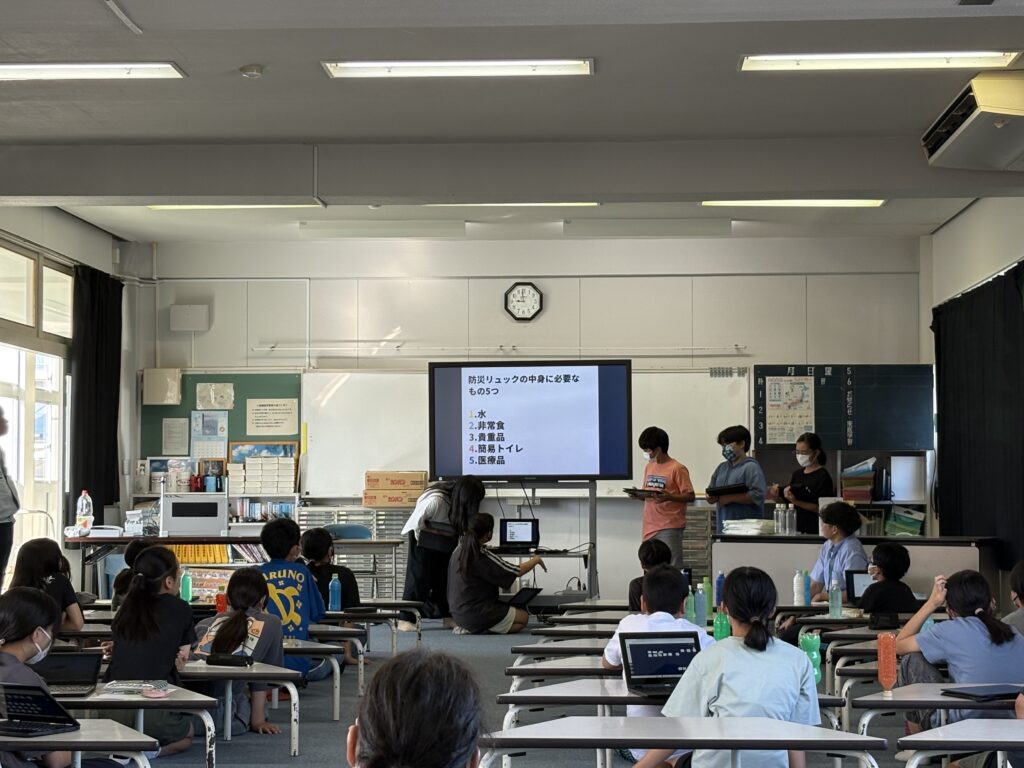 10/17(金)、高知市立春野西小学校にて5年生、6年生へ、それぞれの防災のテーマに沿った授業を行い、廊下にはさまざまな防災用品を展示しました。