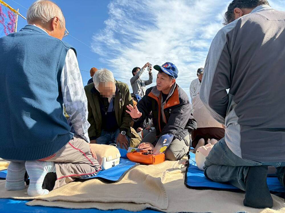 2部構成になっており、第1部は南消防署職員によるAEDの使い方の説明や、本物の粉末消火器を使用した消火訓練、島田工務店さんご協力のもと工具を用いた救助方法の実演、実際に山まで逃げる避難訓練を行いました。