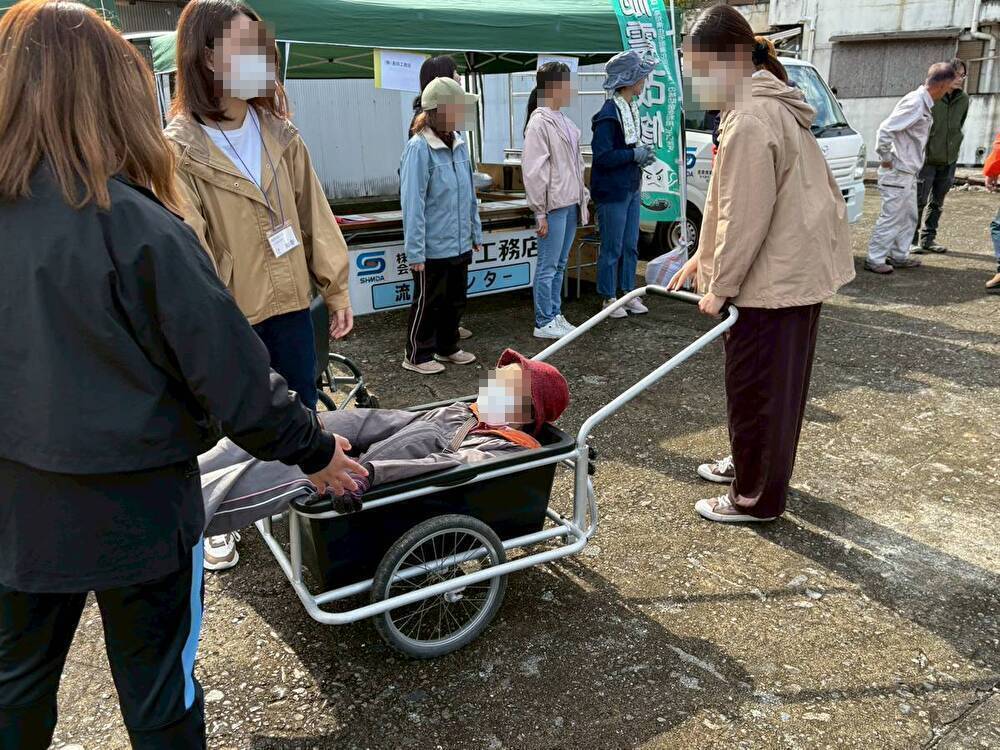 高齢者が多い仁ノ地区では、避難の際にリヤカーや担架を使用することを想定しています。「どう動かすか」「どう乗せれば負担が少ないか」など、いろいろな意見が出ていました。担架をかつぐ学生さんも「二人で持ってるのに案外重い」と、実際に感じる人の重みに驚いていました。
