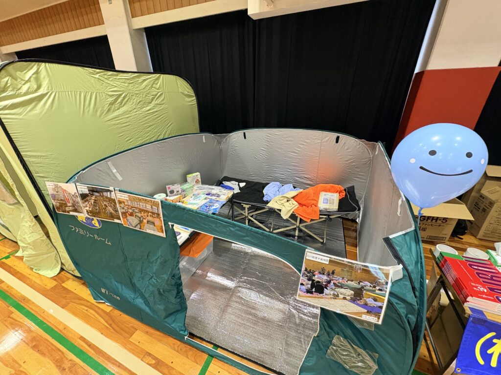 展示内容は、避難所で生活するスペースとしてパーテーションを置いたり、非常食・ライト類・毛布・非常用持出袋等を置き、非常食に関しては一部試食コーナーも設けました。「備えてはいるけど実際に食べたことがない」というお声もいただき、試食コーナーは大変喜ばれていたように感じます。ご自宅の備えの参考になれたのではないでしょうか。