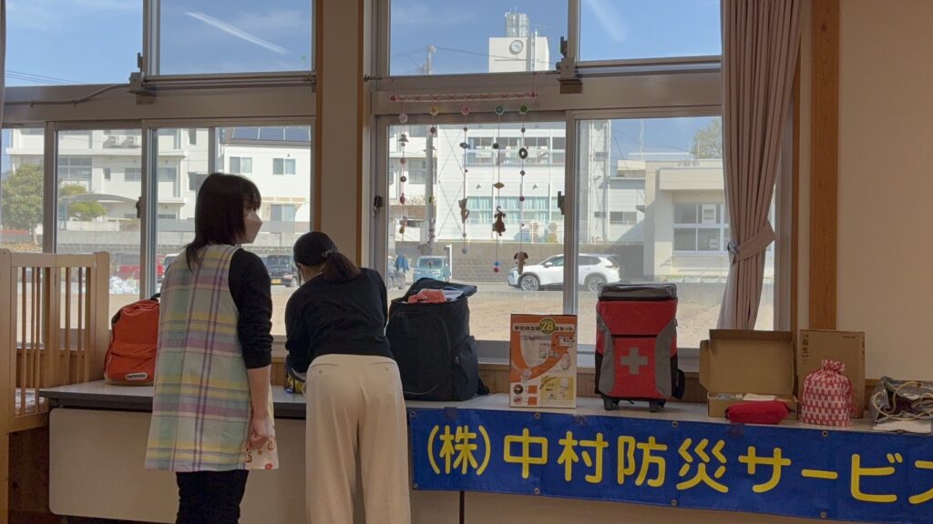 展示・説明では、子育てセンターなかよしの職員の方と、弊社防災士個人の防災リュックを展示し中身を見ていただいたり、実際に背負って重さを体験していただきました。自分の家で備えるとしたらどんなものがいるだろう?防災リュックに入れるなら何がいいだろう?と相談してくださるお母さんもいらっしゃいました。「防災」を自分事として考えるきっかけになれたのではないかと思います。