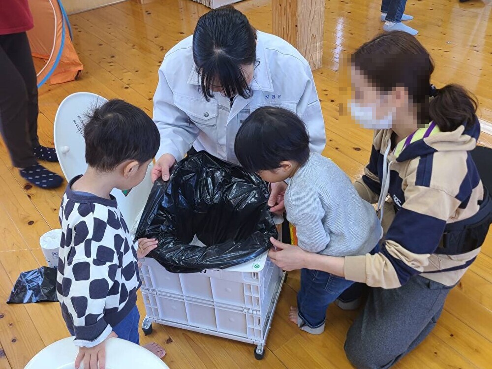 講座の後は、非常食の試食や3種類の非常用トイレの体験も行いました。「備えてはいるけど実際に食べたことがない、使ってみたことがない」というお声もありました。その為、非常用トイレは香美市指定避難所配備のもの、凝固剤タイプ、シート一体型タイプの3種類をご用意し、色水を使った実験でそれぞれの強みを知っていただきました。試食では最近の非常食の美味しさに驚きの声もあがり、赤ちゃんたちはもちろんお母さん方にもしっかり味わっていただけたようでした。実際に見て触れて知ることで、より具体的に防災備蓄品の知識と意識の向上につなげる良い機会になったと思います。